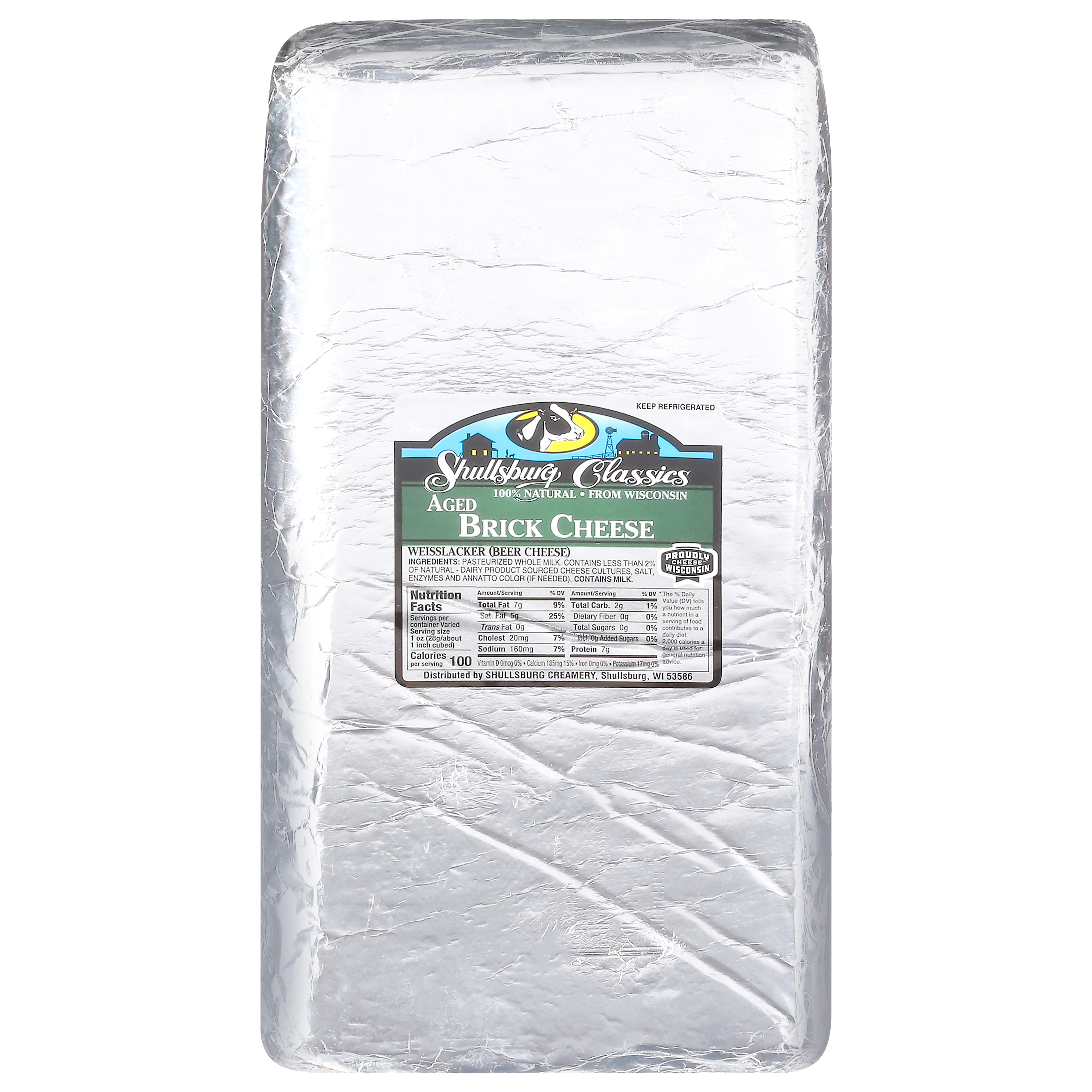 Our Aged Brick (also known as “Schmier Brick”) has a pungent and robust flavor. This is a washed rind, surface ripened cheese with a rich, golden texture and is wrapped in traditional foil.