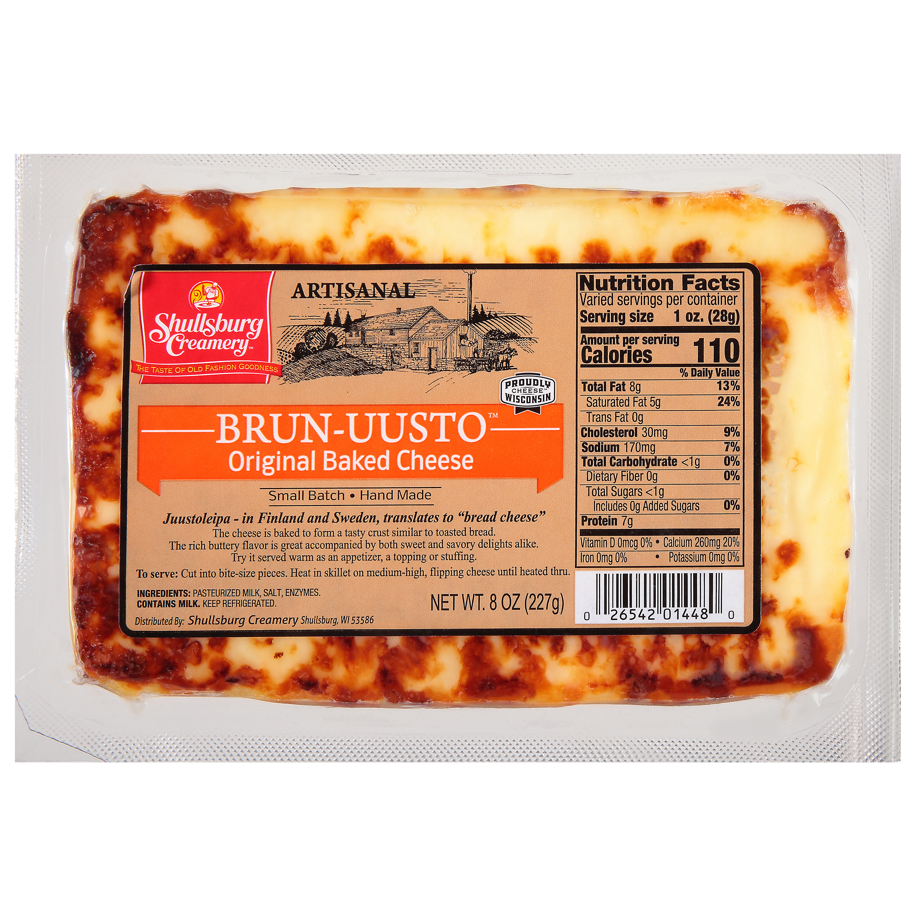Shullsburg Creamery Brun-Uusto is made in the traditional old world way of Sweden and Finland. It is known throughout history as “juustoleipa” or “bread cheese”. Our Brun-Uusto is baked to form a tasty crust similar to toasted bread. The rich, buttery flavor comes to life when fried on a griddle and served warm.