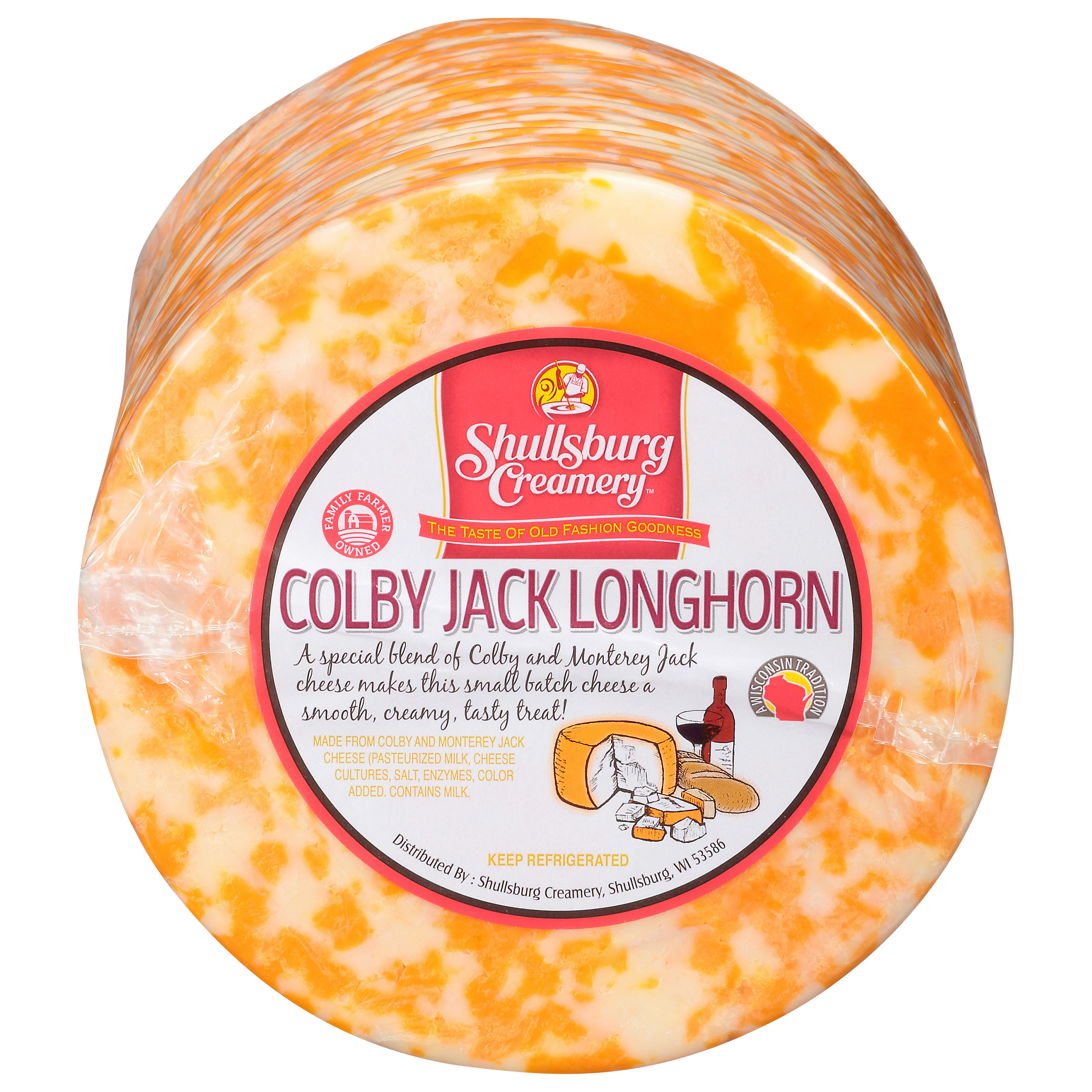 We blend our Colby and Monterey Jack together to create this marbled cheese that is mild and creamy. Colby Jack is one of America’s favorite cheeses! Our Colby Jack is made in the traditional longhorn style. The longhorn is then cut in half for convenience.