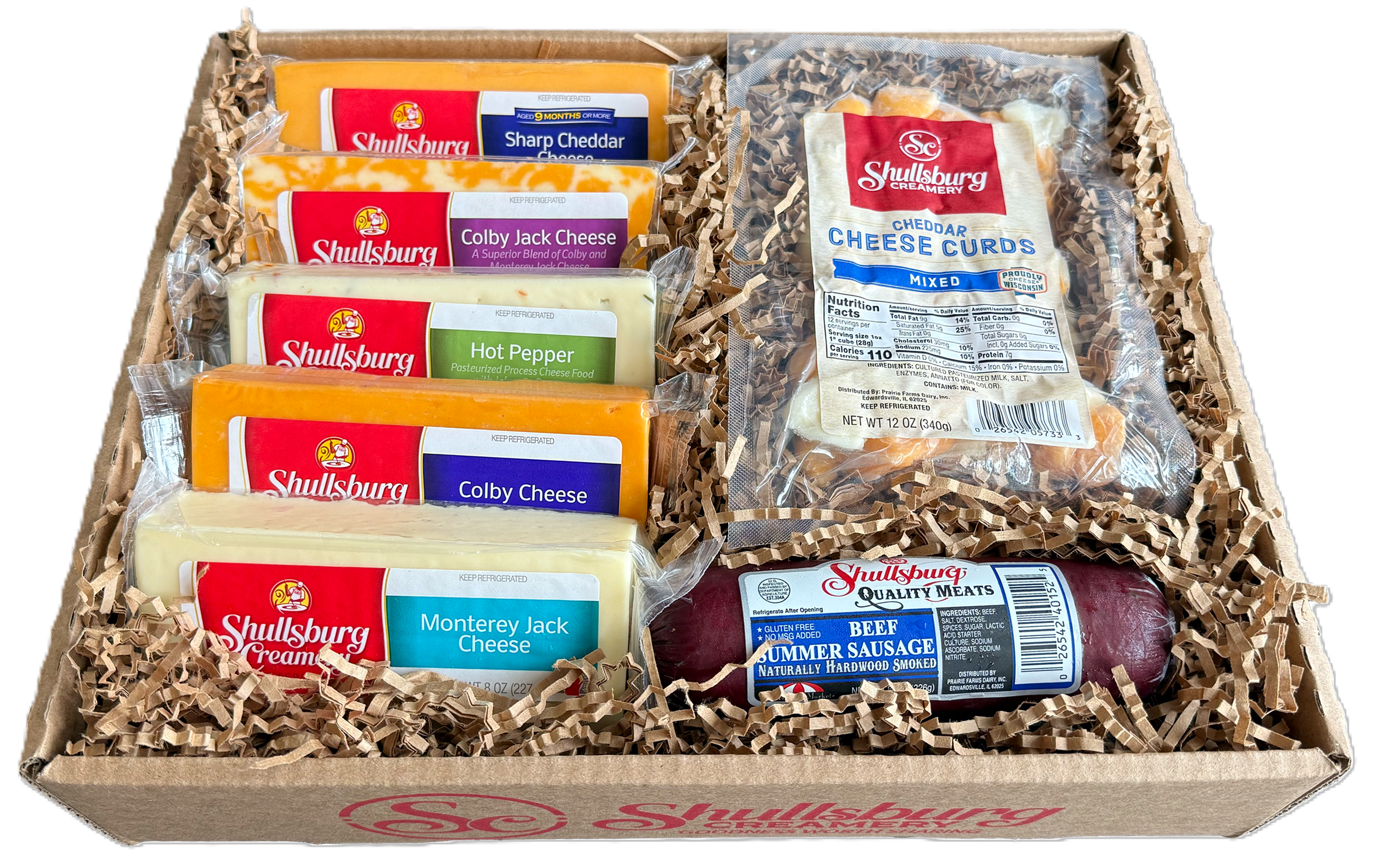 Over six pounds of cheese and sausage in a large variety including our Brewster House Spreads and our summer sausage, finished off with crackers for a truly wonderful gift. Includes: 1lb each: Colby and Colby Jack Cheese. 10 oz. each: Cheese N Hot Pepper and Sharp Cheddar. 10 oz each: White Sharp, Bacon, Plum Wine and Chipotle Brewster House Spreads. 7 oz. each Original Summer Sausage & Beef Summer Sausage. Crackers.
