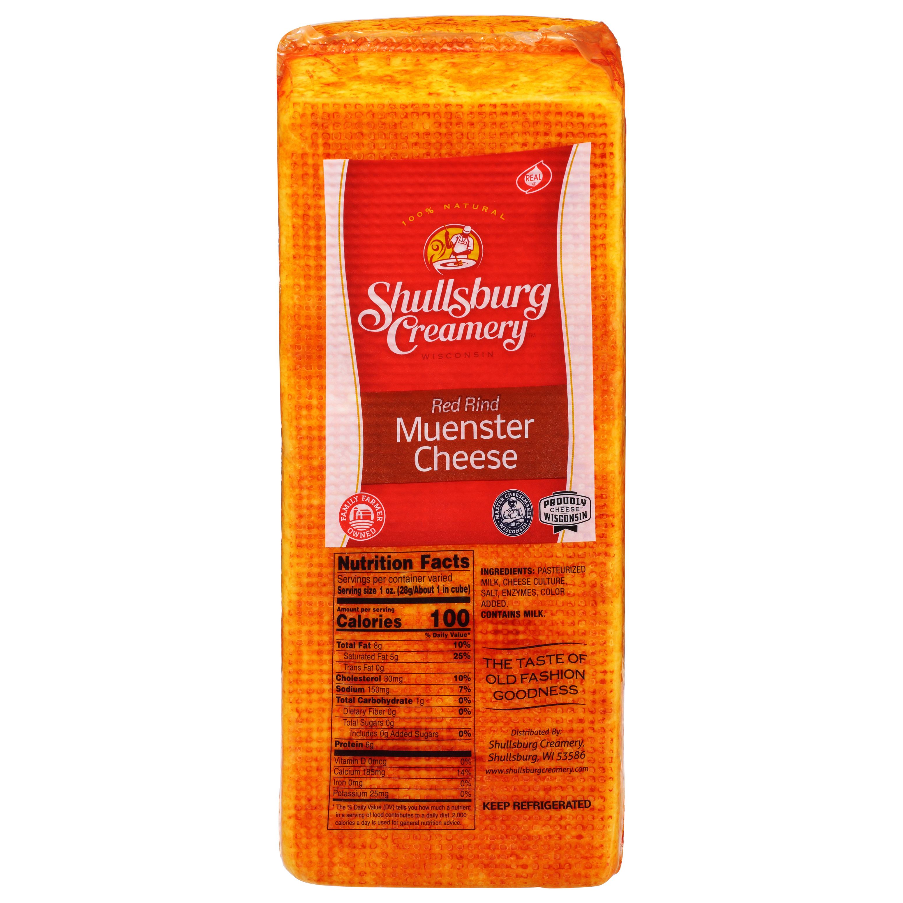 Muenster is a washed rind cheese that is semi-soft, mild and creamy. The cheese itself is pale in color and has an orange rind which make it very attractive when placed on a cheese tray or sliced.